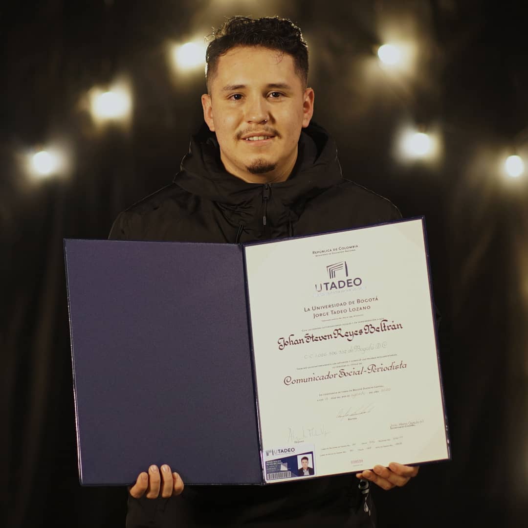 Johan Reyes, por su parte, recibió el diploma que lo acredita como comunicador social – periodista en su trabajo, en los estudios de Rafael Poveda Televisión, donde, desde que realizó sus prácticas profesionales, labora como realizador audiovisual, en importantes proyectos para Telemundo Miami, Teleantioquia, Canal Capital y un proyecto digital para el canal de Youtube Impacto.