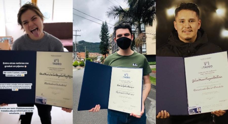 En una jornada atípica, marcada por el distanciamiento social y el confinamiento en casa, Tomás Galvis recibió, justo a tiempo, el fruto por el cual luchó durante los últimos cuatro años y medio: su título como profesional en Publicidad. La felicidad invadió su vida y la de su familia, tal como ocurrió con los 429 tadeístas que recibieron su título de pregrado. En esta jornada de grados también recibieron su título algunos de nuestros egresados de posgrado: Milton Mauricio Herrera (Doctor en Modelado en Política y Gestión Pública), y Gina Lucía Hernández Mercado (especialista en Gestión de la Seguridad y Salud en el Trabajo)