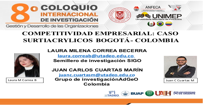 Finalmente, el profesor Juan Carlos Cuartas Marín, también del Área Académica de Administración, Contaduría y Mercadeo de Utadeo, en conjunto con Laura Milena Correa Becerra, estudiante del programa de Administración de Empresas e integrante del Semillero de Investigación en Gestión y Organizaciones (SIGO), perteneciente al grupo de investigación AdGeo, presentaron la ponencia “Competitividad empresarial: caso Surtiacrylicos Bogotá- Colombia”. Esta ponencia también resultó ganadora en la mesa 6 del evento académico.