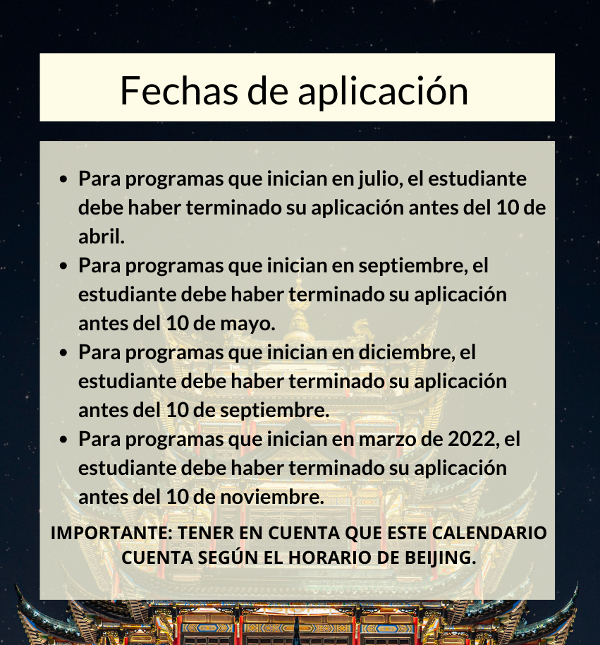 Los estudiantes internacionales que actualmente están estudiando en China no pueden aplicar. | HSKK Intermedio: mínimo 60 puntos | |