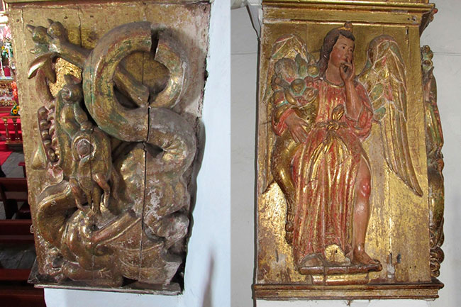 Pero el diablo no está solo en Tópaga. Dos dragones y dos ángeles del silencio lo acompañan. El primero, recordando a la maldad que proviene del inframundo y retorna eternamente a la tierra (es un dragón que se come la cola). Mientras el silencio representa el secreto y el preludio de la revelación divina, de la palabra de Dios: con un dedo en la boca pide escuchar y no hablar. En especial, bajo la mirada del diablo, que más que muerto, está vivo y anda entre nosotros.