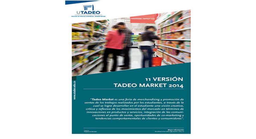 El Programa de Mercadeo invita a la comunidad tadeista a participar de la 11a versión de la Tadeo Market 2014, actividad que presenta los mejores trabajos desarrollados por estudiantes de Mercadeo inscritos en la materia Merchandising y Promoción de Ventas. En esta oportunidad, el evento contará con la visita de representantes de las empresas involucradas en las propuestas de Marketing y Merchandising elaboradas por los estudiantes que participan en la Feria.