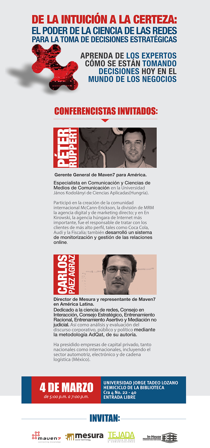 “De la intuición a la certeza: el poder de la ciencia de las redes para la toma de decisiones estratégicas”, es el nombre de la conferencia que está organizando el programa de Publicidad y que se llevará a cabo el martes 4 de marzo, desde las 5:00 de la tarde en el Hemiciclo de la Biblioteca.