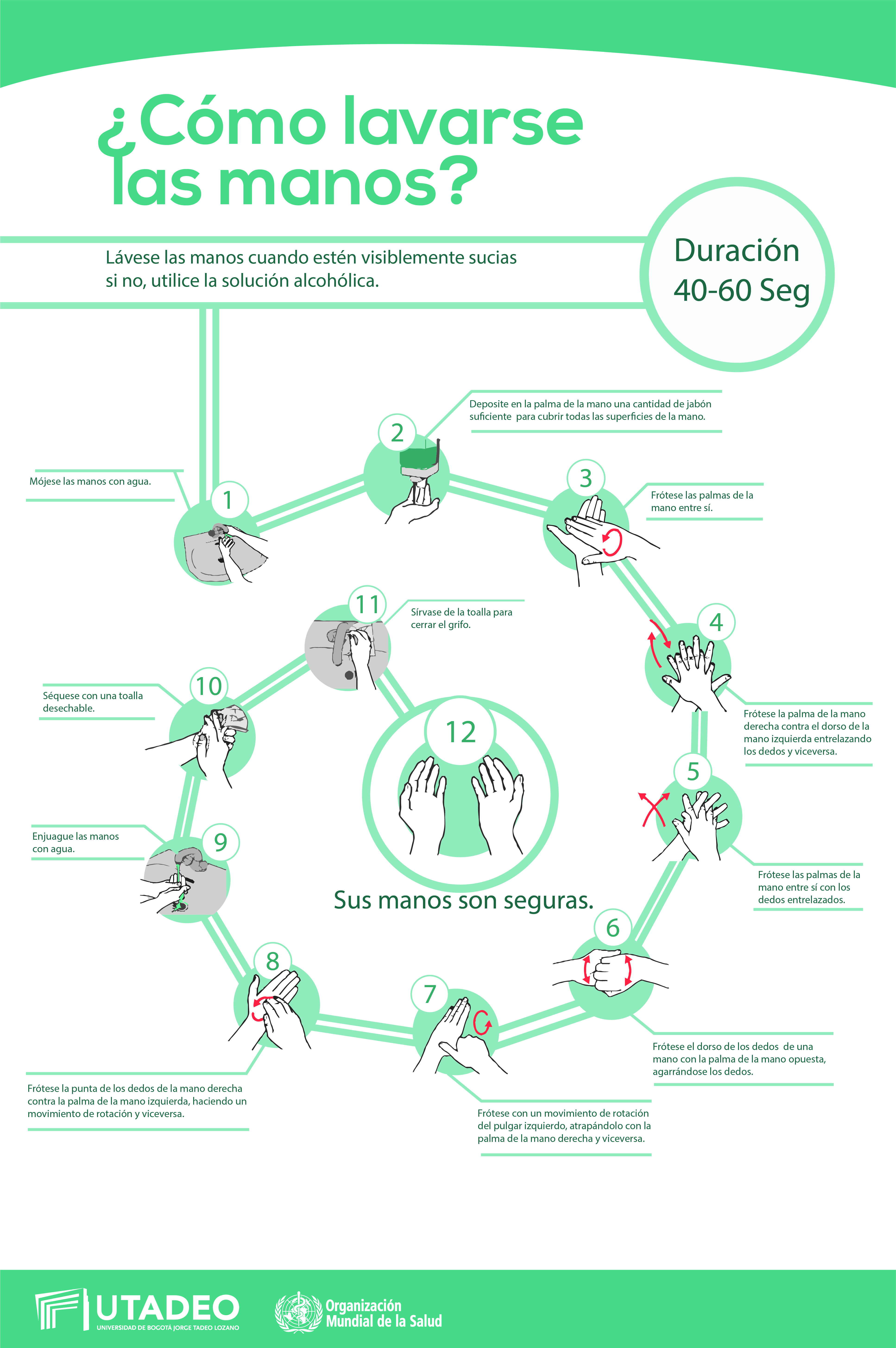 Pasar las manos por el agua fugazmente, no sirve. Las manos deben lavarse con agua y jabón frotándolas entre si, por 40 segundos, así las bacterias no prosperarán.