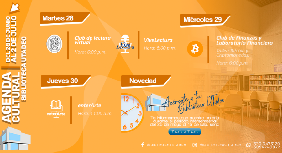 Agenda cultural de tu Biblioteca UTadeo de la semana del 28 de junio al 2 de julio.