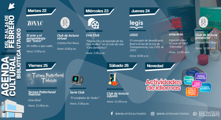 Agenda cultural de tu Biblioteca UTadeo de la semana del 21 al 26 de febrero.