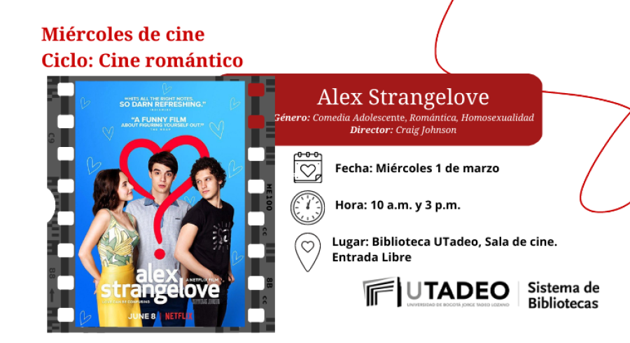 DestacadasMiércoles de cine: Alex Strangelove Compartir en Miércoles, Marzo 1, 2023Programación Miércoles de cine 2023♥ Te invitamos a disfrutar la película “Alex Strangelove" Fecha: Miércoles, 01 de marzoCiclo: Cine románticoHora: 10 a.m. y 3:00 p.m.Lugar: Sala de cine, cuarto pisoEntrada libreTrailer: