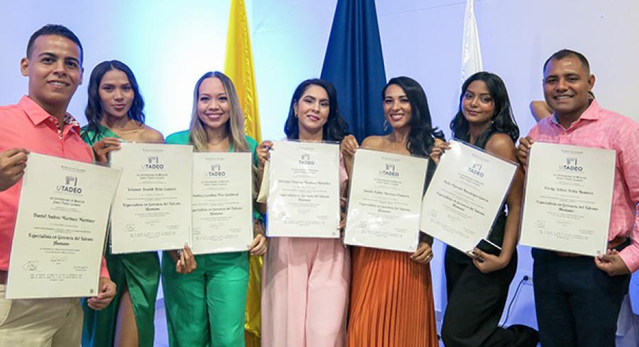 La ceremonia fue presidida por la Vicerrectora Administrativa de Utadeo, Liliana Álvarez Revelo, quien estuvo acompañada en la mesa principal por Carlos Pachón Mantilla, coordinador de la sede Santa Marta.