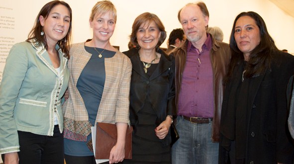 Paula Sierra, Rocio Arias Hofman, Andrés Hoyos y Yirama Castaño acompañarón a Cecilia María Vélez White (en el centro) durante la inauguración. Fotografía: Laura Ardila - Oficina de Comunicaciones UJTL