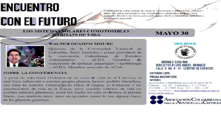La Asociación Colombiana para el Avance de la Ciencia ACAC, lo (a) invita a participar en la conferencia "Los sistemas solares como posibles hábitats de vida", a cargo del Doctor Walter Ocampo Moure, que se realizará el viernes 30 de mayo de 2014, a las 9:00 a.m., en el centro de eventos de la Biblioteca Luis Ángel Arango (Calle 11 No. 4 - 14), Bogotá.
