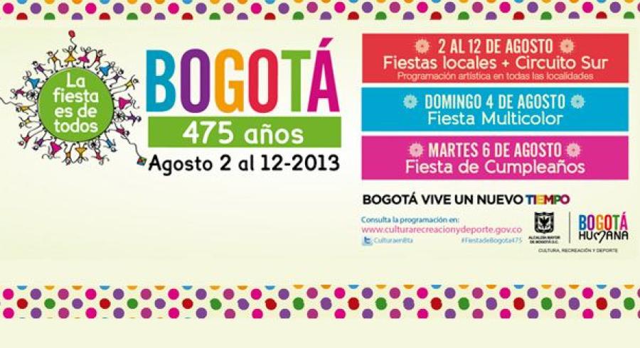 La alcaldía mayor de Bogotá tiene preparada una gran fiesta para celebrar el cumpleaños 475 de Bogotá. La cita será en los parques, plazas, casas de la cultura, salas de teatro, auditorios, corredores culturales y ambientales de la ciudad, además de toda esta fiesta y algarabía se tienen conciertos programados para que los disfruten todos los ciudadanos.