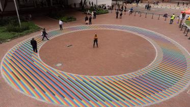 Función didáctica en vivo de danza a través de la intervención artística con la obra donada a la Universidad Jorge Tadeo Lozano por uno de los revolucionarios del arte cinético, el maestro franco-venezolano, Carlos Cruz - Diez, reconocida como el "Anillo de inducción cromática".