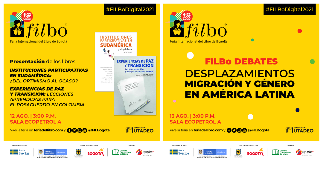 Entre el 6 y el 22 de agosto se realizará de manera virtual una nueva edición de la Feria Internacional del Libro de Bogotá (Filbo), y Utadeo se une a esta celebración con la presentación de siete novedades en la agenda oficial de la Feria los días 9, 10, 12, 13, 17, 18 de este mes; eventos que se podrán seguir desde la página oficial de la Feria, y en donde los visitantes podrán ingresar a las diferentes salas virtuales que se han dispuesto para los eventos; siendo las salas Ecopetrol A y B en las que la Editorial Utadeo participará.