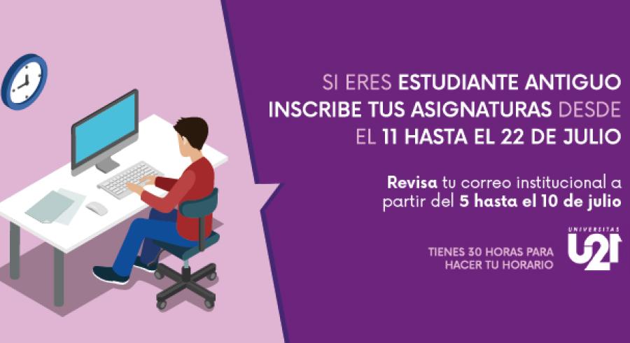 Recuerde que los turnos para inscribir las asignaturas, van del 11 al 22 de julio, por ello le recomendamos estar pendiente de su correo electrónico institucional a partir del 5 de julio, para que revise la fecha y hora que le fue asignada la cita para realizar el horario. Le sugerimos no dejarla pasar, pues esto le afectará la disponibilidad de su oferta académica y generará recargos en el valor de su matrícula.