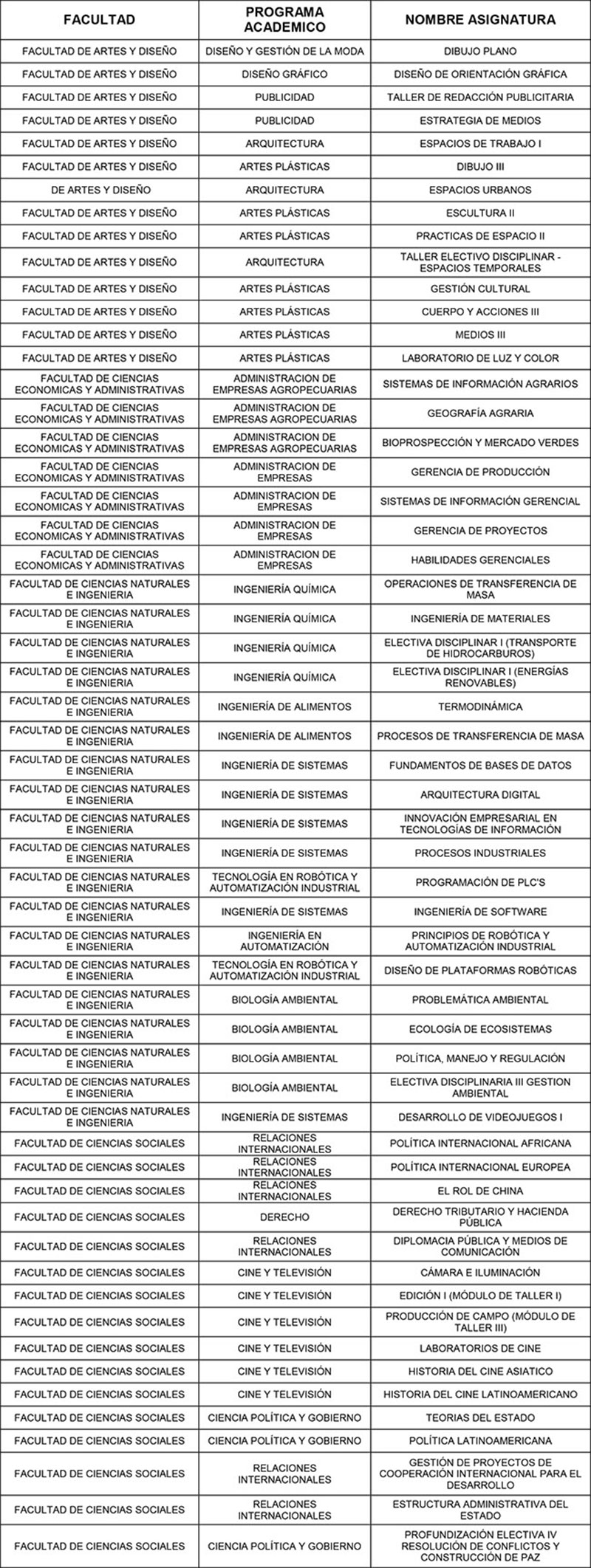 La participación en este proceso no constituye compromisos contractuales entre los interesados y la Universidad. La Universidad de acuerdo con los requerimientos que se produzcan comunicará oportunamente la confirmación de asignatura, periodo y horarios.