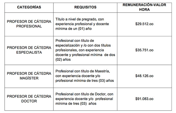 NOTA: Los profesores de cátedra, no forman parte de la carrera profesoral de la Universidad. (Artículo 19, Parágrafo Primero, Estatuto Profesoral).