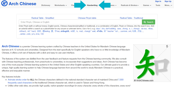 Arch Chinese tiene una sección de práctica de escritura que permite escribir con el mouse, si estás en un computador, o con la mano, si estas en un celular o tablet.