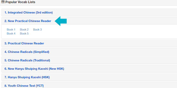 A continuación puedes elegir de una lista de vocabulario. Dentro de las opciones te recomendamos elegir la opción  del libro “New Practical Chinese Reader”, el mismo que ves en clase con nuestras profesoras.