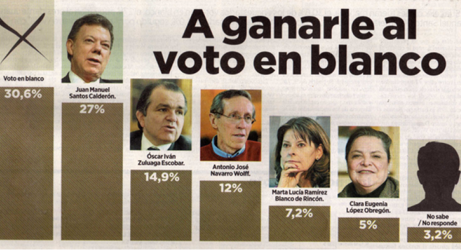 La más reciente encuesta de medios realizada por Gallup, y presentada el pasado 11 de noviembre, presenta un claro dominador: el VOTO EN BLANCO. Preguntas muchas ¿la competencia de partidos quedo en segundo plano? ¿Se desecha de forma directa que los partidos como el Polo Democrático, Partido Liberal, Partido Conservador, Alianza Verde y Cambio Radical se hagan con la victoria legítima? ¿La competencia entonces se concentra en el nuevo movimiento Uribe Centro Democrático y el Partido de la U?, en este contexto ¿el voto en blanco podrá ser ganador?