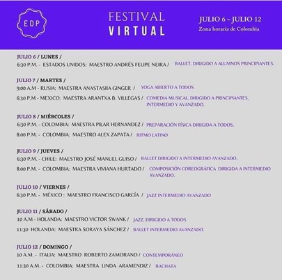 La Escuela de Danza Petipa te ofrece del 6 al 12 de julio una oportunidad para bailar y sentirnos mas presentes. Conoce la programación, donde prodrás encontrar 12 clases, 12 maestros como invitados nacionales e internacionales. Para inscripción o mas información: 57-3112307863