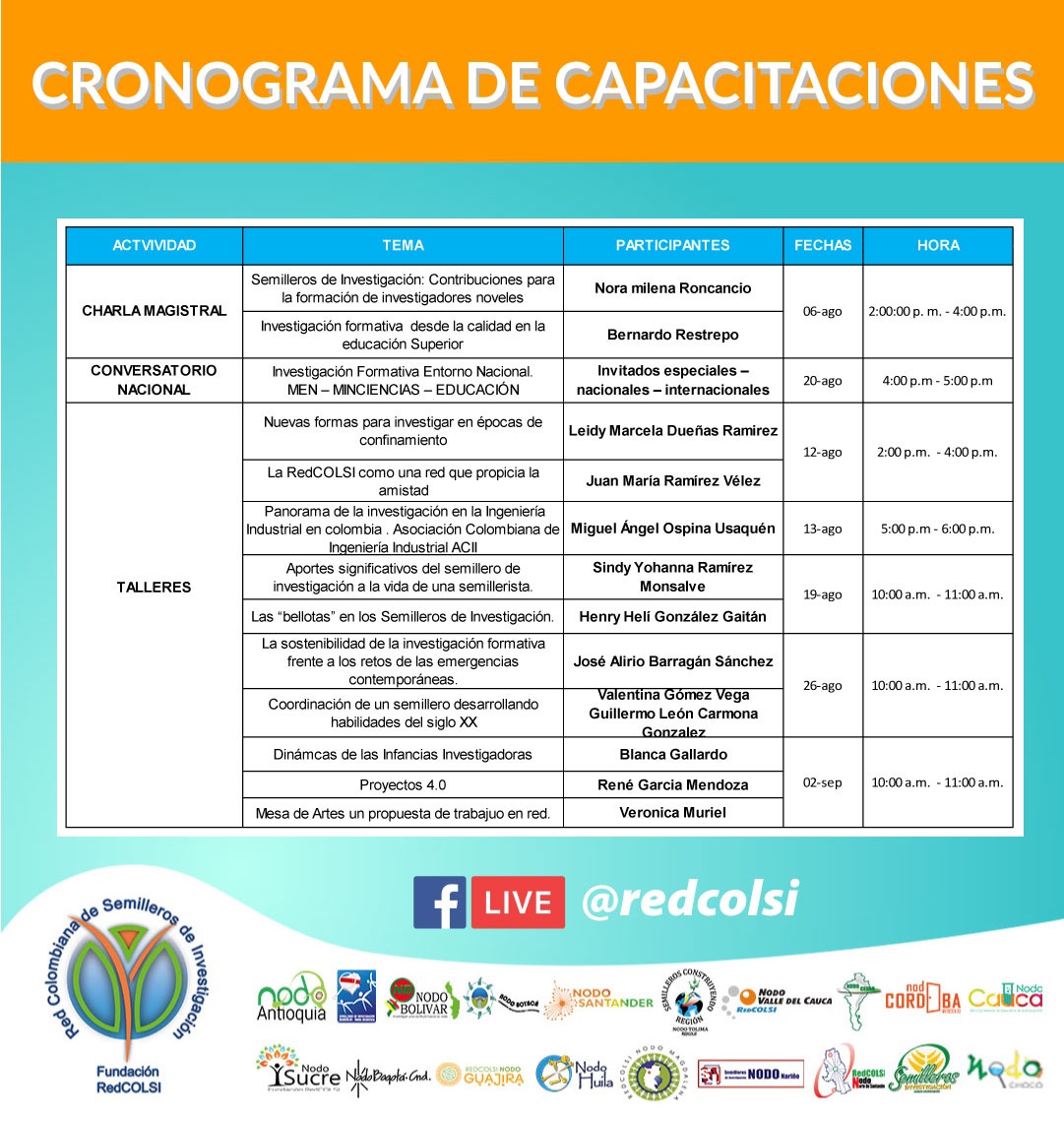 Todos los eventos, tanto de las salas de socialización de las ponencias de los semilleros, como en el ciclo de conferencias y capacitaciones, se transmitirán en vivo a través de la página oficial de Redcolsi en Facebook: https://www.facebook.com/redcolsi