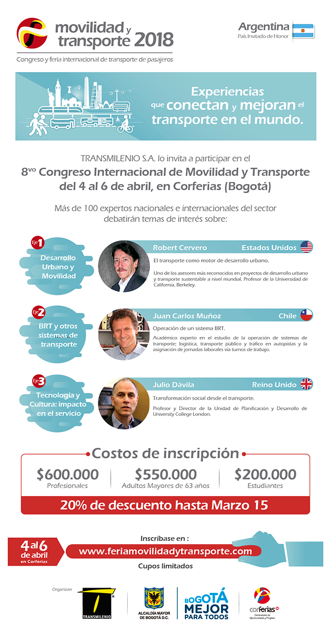 Del 4 al 6 de abril se celebrará la octava versión del Congreso Internacional de Movilidad y Transporte, un evento organizado por Corferias, Transmilenio S.A y la Alcaldía Mayor de Bogotá, que contará con representantes del sector de Estados Unidos, el Reino Unido y Chile, entre otros paises.