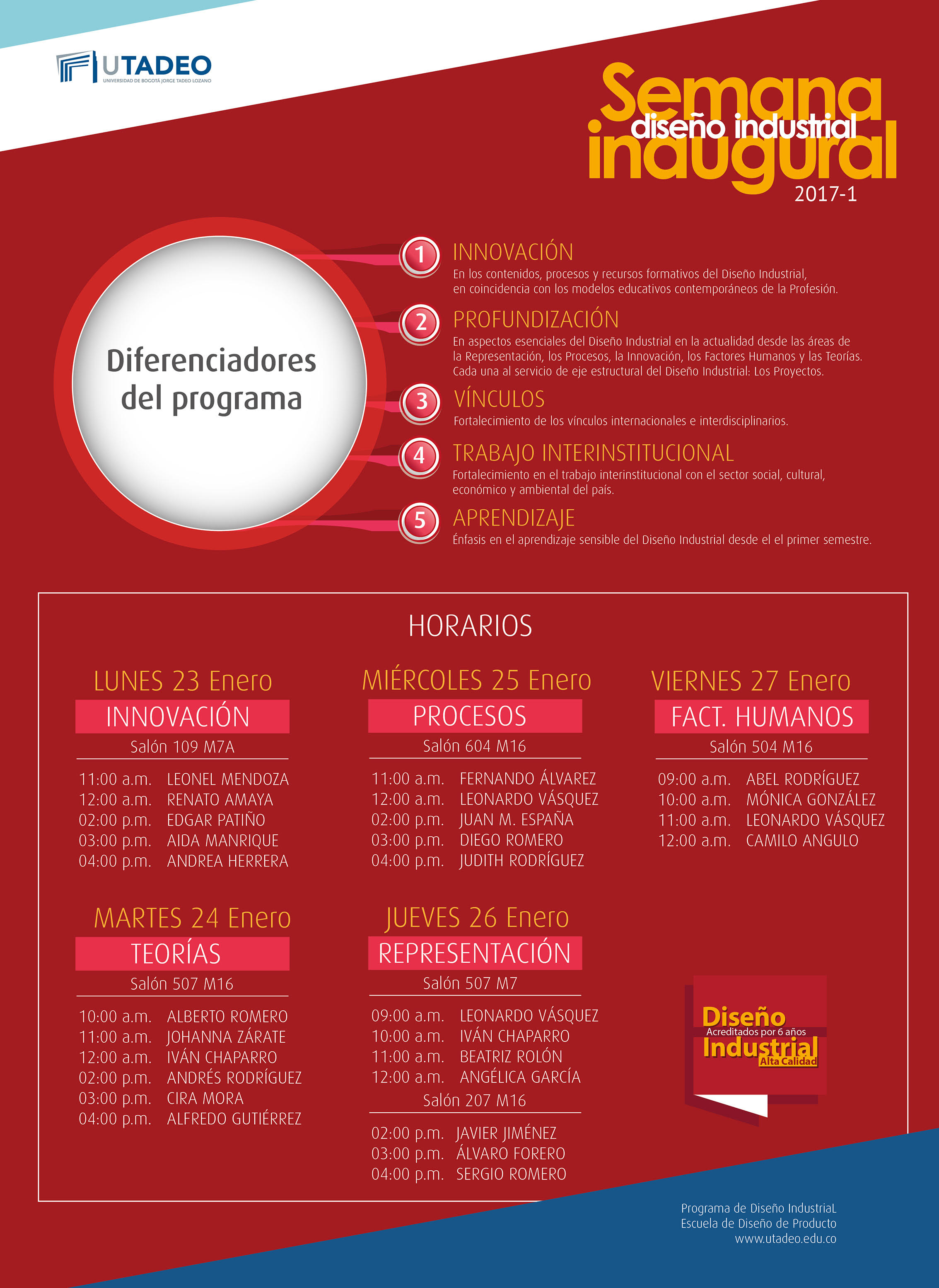 Durante esta Semana Inaugural, también se hablará de las áreas de conocimiento que orientan los procesos de Investigación, Creación e Innovación de la Escuela de Diseño de Producto. Es imprescindible la asistencia de estudiantes y profesores del programa, dado que este es el espacio para informarse respecto a los propósitos, cambios y oportunidades que se derivan de esta reforma educativa.