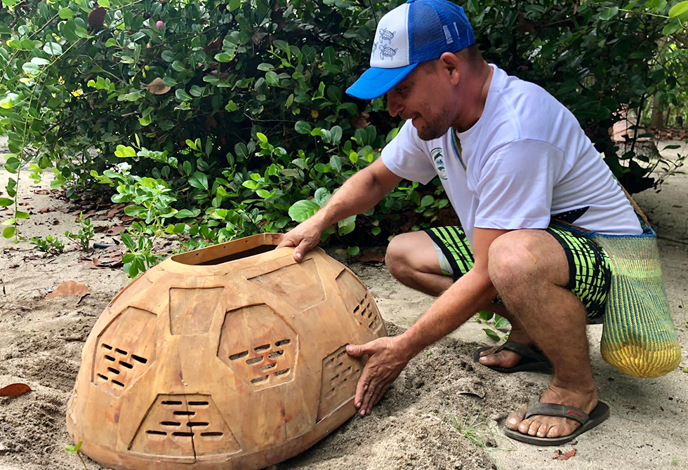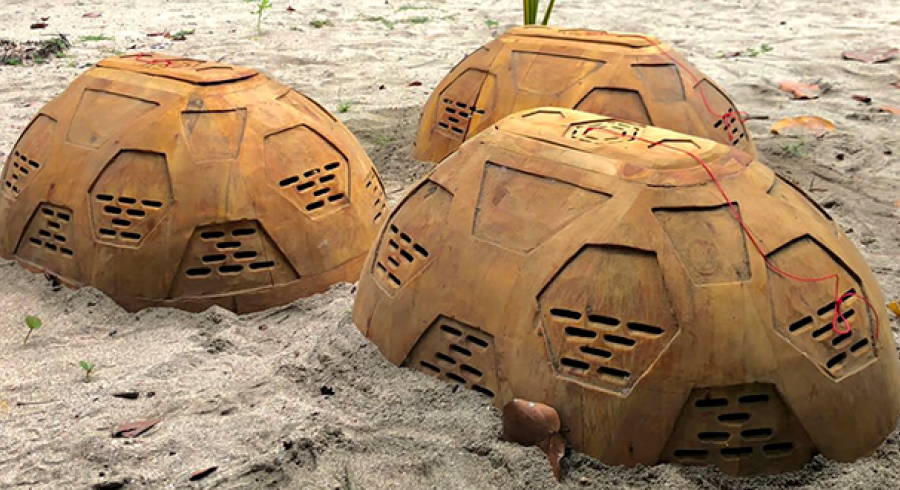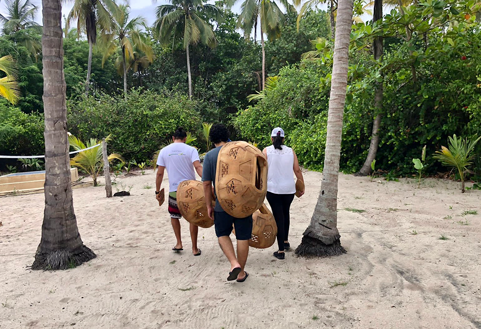 Estos caparazones están hechos con materiales completamente biodegradables, madera de la región tallada por artesanos con agujeros ubicados en la estructura estratégicamente para la circulación de las corrientes de aire. También están recubiertos con una capa de aceite de linaza que reflecta la luz del sol y les da a los domos la propiedad refrigerante que baja la temperatura de la arena. Esta estructura igualmente protege los nidos de depredadores que ponen en riesgo la incubación.