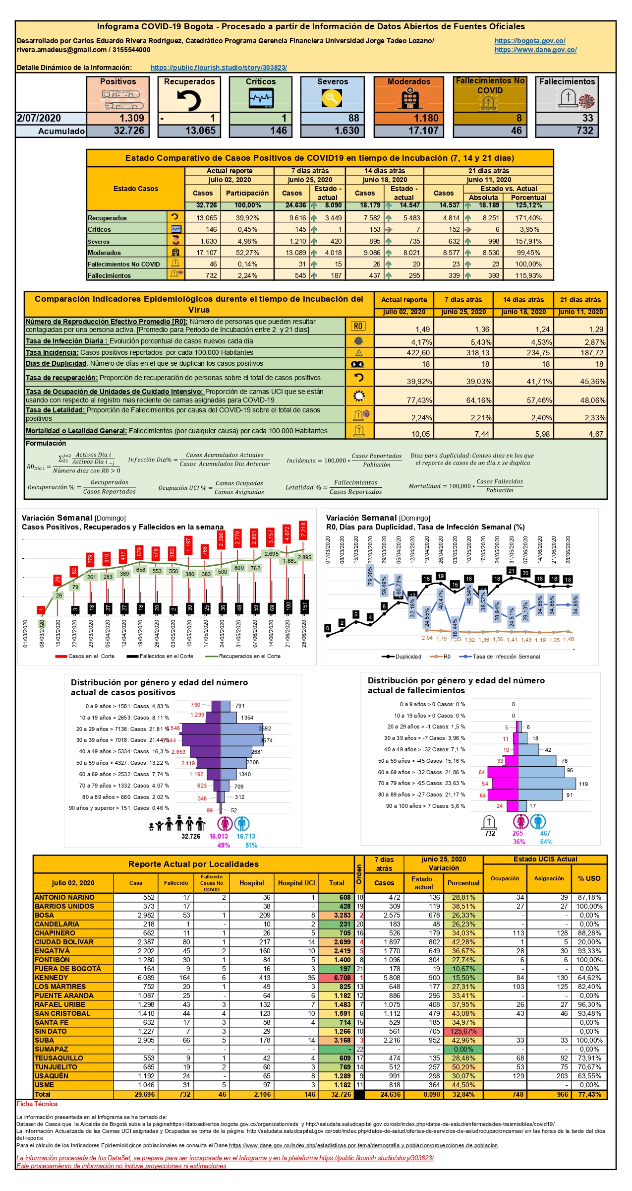 • A 2 de julio, la capacidad instalada de UCIS es de 966 camas, las cuales están ocupadas por 728 personas [146 confirmados COVID y 602 probables]; así, el porcentaje de ocupación es de 77,43%; 21 días atrás era del 48.06%. Se destaca que las localidades de Bosa, La Candelaria, Puente Aranda, Santa Fé y Usme no tiene asignación de camas UCI adulto.