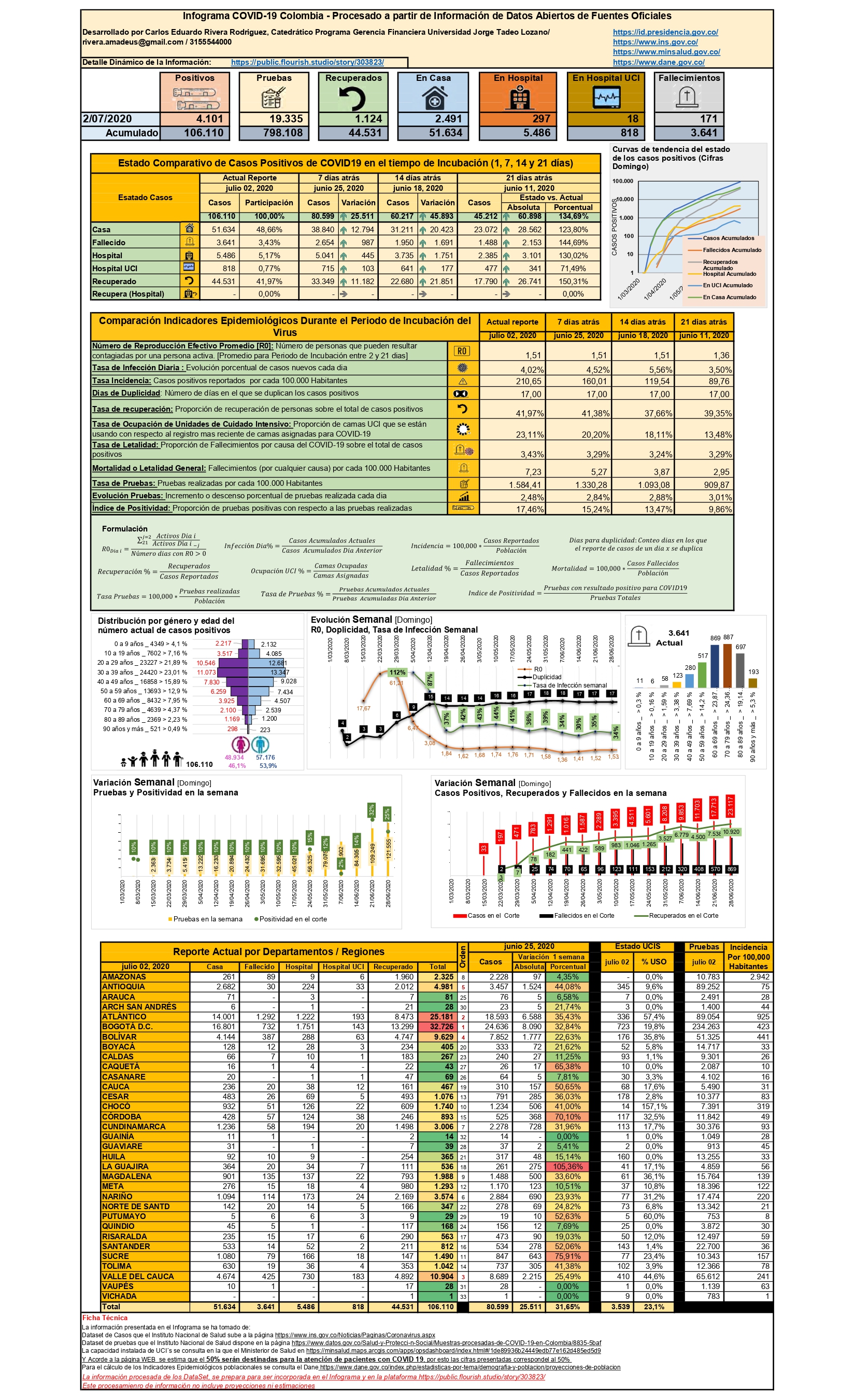 • A 2 de julio, y comparando 21 días atrás, las pruebas se han incrementado en un 70%, llegando a 798.108, equivalente a 1.584 pruebas por cada 100.000 habitantes, frente a las 909 que se presentaban hace tres semanas; actualmente la positividad es del 17%, lo que conlleva a un acumulado de 106.110 casos [134% de incremento]; se han recuperado 44.531 personas [incremento del 150,31%] y han fallecido 3.641 personas [incremento del 144,69%].