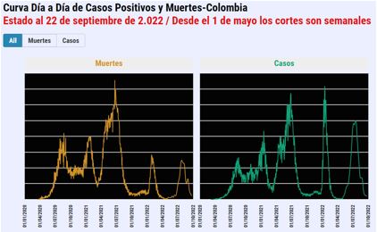 La situación de la pandemia en nuestro país, muestra un continuo descenso desde la segunda semana del mes de julio, la información suministrada por el Instituto Nacional de Salud para el 22 de septiembre, muestra un descenso en la incidencia para la semana de 20,48%, y que en cifras enteras es de 990 nuevos casos, llegando a 6’306.552 pacientes de los que se han recuperado el 97%; con respecto a la letalidad el descenso semanal fue de 39.47%, con 23 fallecimientos y un agregado de 141.769 muertes que ha sido un descenso continuado desde la primera semana del mes de agosto; actualmente se encuentran 2.822 pacientes activos. Con respecto a la vacunación, el reporte más reciente del Ministerio de Salud al 13 de septiembre, indica que se han aplicado 88’573.230 dosis; 36’103.036 personas cuentan con 1 dosis, 30’005.267 personas cuentan con segunda dosis, 36’640.115 personas cuentan con el esquema inicial completo incluidas las personas con monodosis, 14’059.425 personas cuentan con un refuerzo y 1’770.650 cuentan con segundo refuerzo.
