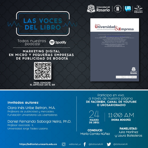 El profesor Daniel Sabogal, del Área Académica de Publicidad de Utadeo, fue invitado a participar en los espacios digitales de la Editorial Universidad del Rosario, a propósito de la publicación del artículo “Marketing digital en micro y pequeñas empresas de publicidad de Bogotá", del cual es coautor.