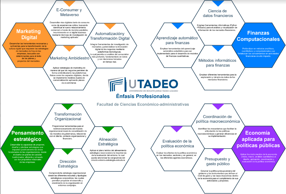 La diversidad de conocimientos en las áreas económicas y administrativas amplía las posibilidades de aprendizaje y facilita la especialización de los profesionales en diferentes temáticas. El estudiante podrá enfocar los créditos de su componente electivo (3 asignaturas) en fortalecer sus conocimientos en un área específica que hoy son altamente demandadas en el mercado laboral e integrarse con los demás conocimientos obtenidos en su carrera profesional, permitiendo su perfilamiento profesional y generando diferenciales en su formación.