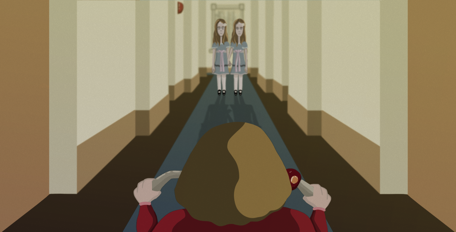 Dependiendo del espacio donde se nos presenta a un personaje, podemos hacernos una idea sobre quién es y qué problemas tiene o tendrá en el futuro. Esto aplica para la mayoría de las películas, por ejemplo, la primera escena de La la land (Damien Chazelle, 2016) nos presenta a Mia atrapada en el tráfico preparando una audición, atascada porque todos van en la misma dirección. Situación que refleja el conflicto interno de Mia: quiere ser actriz, pero muchas más personas buscan el mismo camino. Kubric, con un pensamiento similar, nos presenta al resto de nuestros protagonistas (Wendy y Danny) en la comodidad del comedor de su casa, en medio de su cotidianidad. Donde no solo están en control del espacio —al punto de que Wendy tiene las piernas recogidas sobre la silla—, sino que el dejar ese lugar les traerá problemas en el futuro, problemas que se plantean mediante las acciones de los personajes y sus diálogos, en este caso son dos verbos: comer y jugar. Wendy se enfrentará a la otra cara de Jack cuando intente llevarle algo de comer y Danny pasará por lo mismo cuando se vea obligado a volver a la habitación que comparten en el hotel para buscar un juguete. Ambas desencadenarán en conflicto y son el producto de que los personajes se encuentran en un lugar ajeno: el fantasma de sus problemas futuros se establece en el espacio donde se supone deben sentirse seguros porque no volverán a sentirse seguros estando en otro lugar.