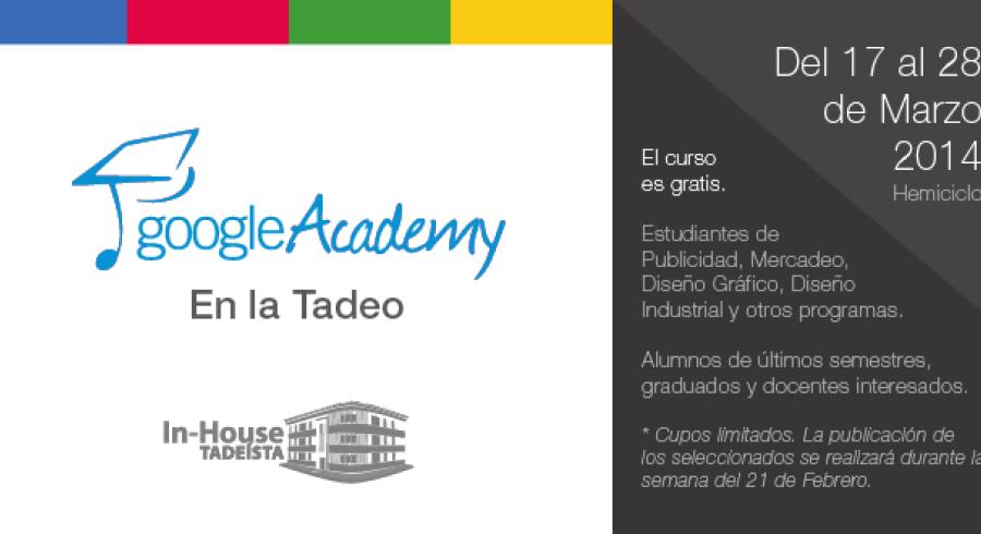 Google Academy es un programa de capacitación y certificación en Google AdWords, la plataforma de gestión publicitaria digital de Google. Por medio del curso es posible obtener un diploma de reconocimiento a nivel mundial en el conocimiento y manejo de dicha herramienta. Los alumnos que finalicen el curso ingresarán a una bolsa de trabajo que Google comparte con sus agencias estratégicas. El Programa de Publicidad en asocio con Google estará realizando del 17 al 28 de marzo de 2014 este evento, si desea participar puede inscribirse dando clic aquí. La duración del curso es de dos semanas y está dividido en dos módulos de 3 sesiones (4:00PM a 7:00PM) y 1 examen cada uno. El segundo módulo solo podrá ser cursado en caso de aprobar el primer examen.