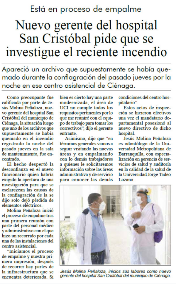 El gobernador de Magdalena, Carlos Caicedo, nombró al nuevo gerente del Hospital San Cristóbal del municipio de Ciénaga. Se trata de Jesús Francisco Molina Peñalosa, odontólogo de la Universidad Metropolitana de Barranquilla y especialista en Gerencia y Auditoría de la Calidad en Salud de Utadeo.