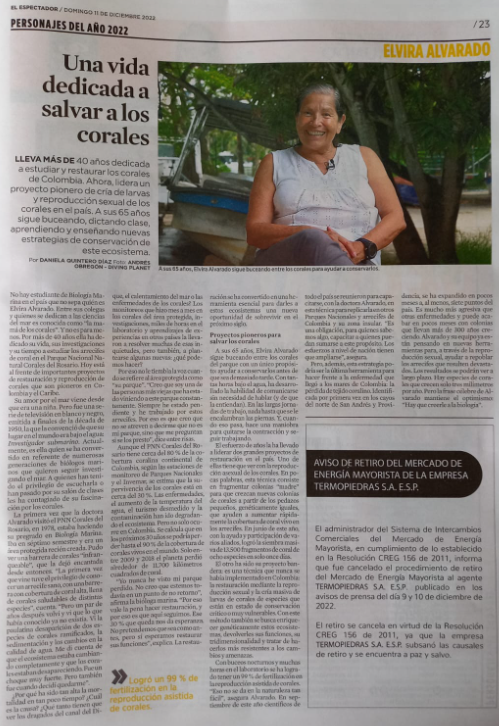 Elvira Alvarado es uno de los referentes para la Biología Marina en nuestro país ya que ha dedicado gran parte de su vida profesional para señalar la importancia que tienen los corales para el equilibrio ecosistémico de los mares, pues en ellos habitan cerca del 25% de sus especies.
