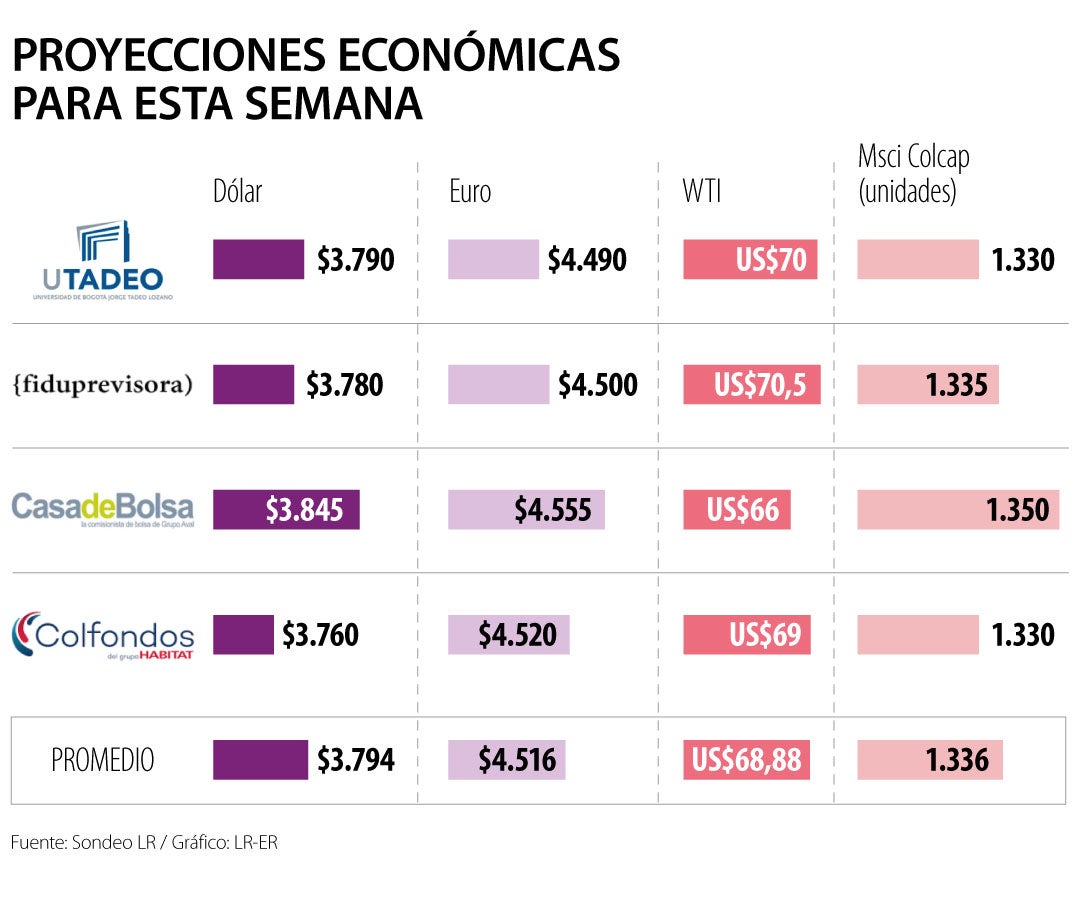 En tercera instancia, proyectan que el barril de petróleo WTI llegará a US$68,88, esto por causa de un posible miedo causado por una desaceleración de las contrataciones en Estados Unidos; para finalizar, el índice bursátil Msci Colcap continuará estable, consolidándose en 1.336 puntos “a medida que aumenta la probabilidad de que los mercados emergentes experimentan una presión a la baja limitada”, explica el medio.