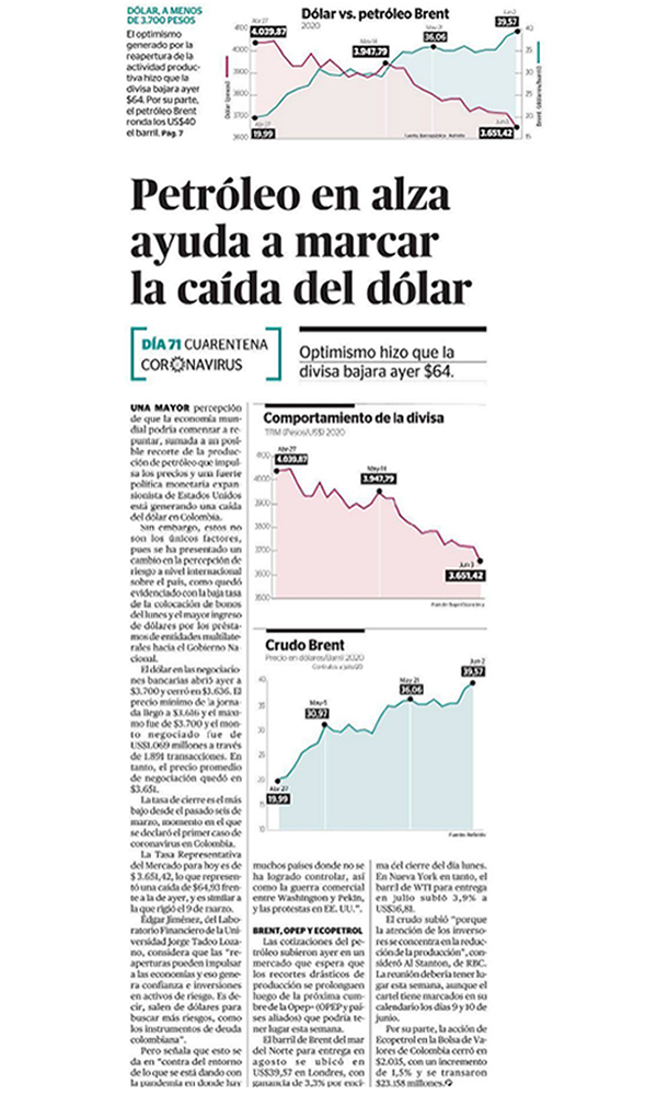Consultado por este mismo medio acerca de la caída del dólar, el profesor Jiménez indicó que las "reaperturas pueden impulsar a las economías y eso genera confianza e inversiones en activos de riesgo. Es decir, salen de dólares para buscar más riesgos, como los instrumentos de deuda colombiana".