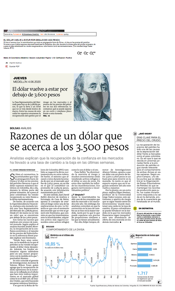 En esa misma línea, el profesor Jiménez explicó en el diario El Colombiano (impreso y digital) que "este optimismo y apetito de riesgo que se sigue viendo entre los inversionistas puede mantener una caída en la tasa de cambio. El peso colombiano se puede fortalecer en la medida en la que los mercados financieros sigan tranquilos ante una abundancia de oferta de esta moneda en los demás mercados".