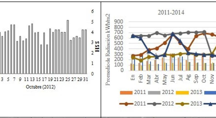 En este trabajo se presentan los resultados de la evaluación realizada a series de datos climáticos para obtener los promedios de radiación solar y temperatura en el Municipio de Quibdó, con el fin de determinar la factibilidad en la implementación de sistemas de generación de energía eléctrica fotovoltaica conectados a la red eléctrica. Para esta evaluación se tomaron como referencia las bases de datos de la estación meteorológica instalada en la Universidad Tecnológica del Chocó y la del IDEAM–110450010; que se encuentra ubicada en el Aeropuerto el Cariño de la Ciudad de Quibdó. Los resultados obtenidos muestran que los meses con mayor radiación son Junio y Julio alcanzando valores aproximados de 3.83 kWh/m2 y los de menor radiación Abril, Agosto y Noviembre con valores aproximados de 1.59 kWh/m2 . La temperatura presenta un comportamiento bastante definido con valores promedios máximos de 26 ◦C y promedios mínimos de 22 ◦C.