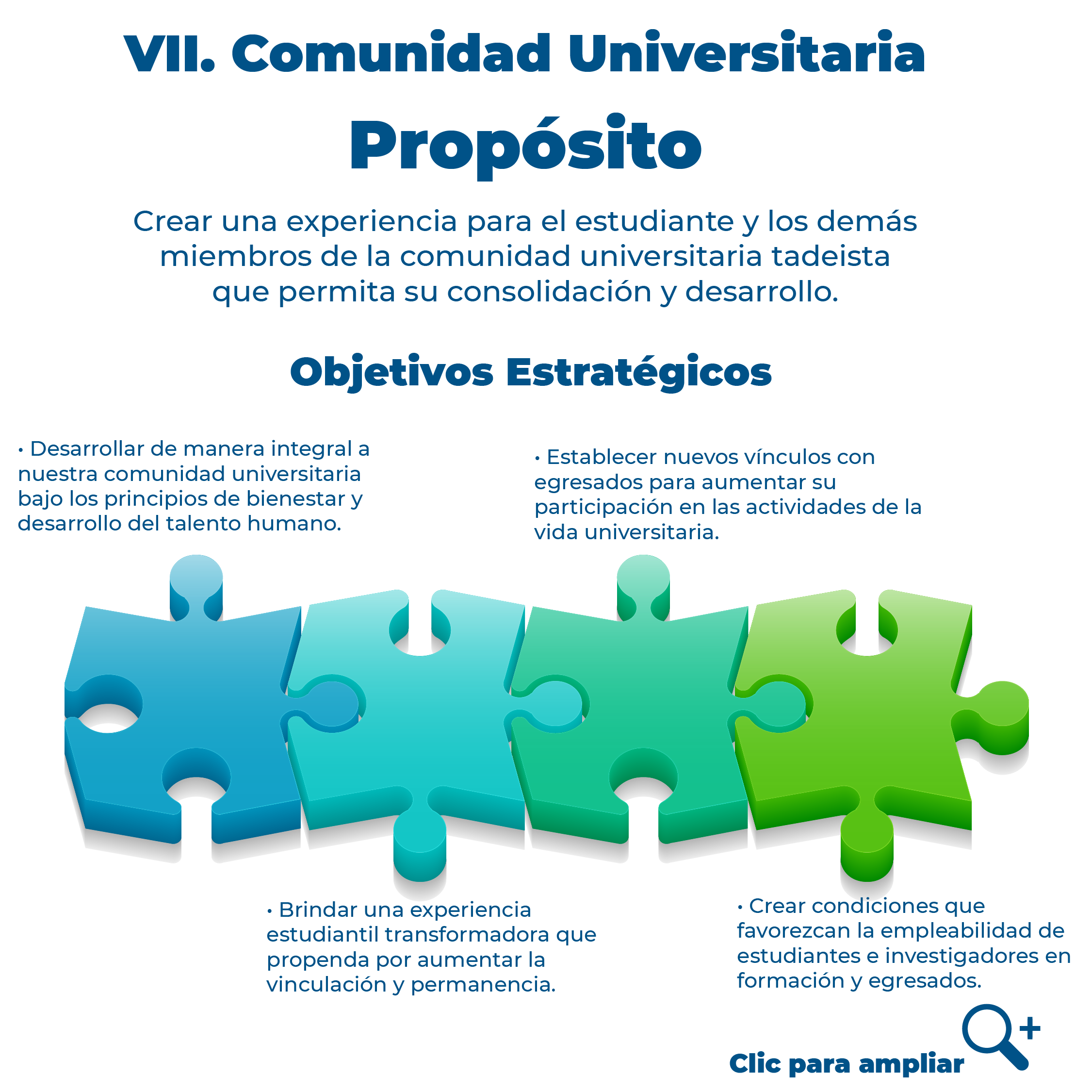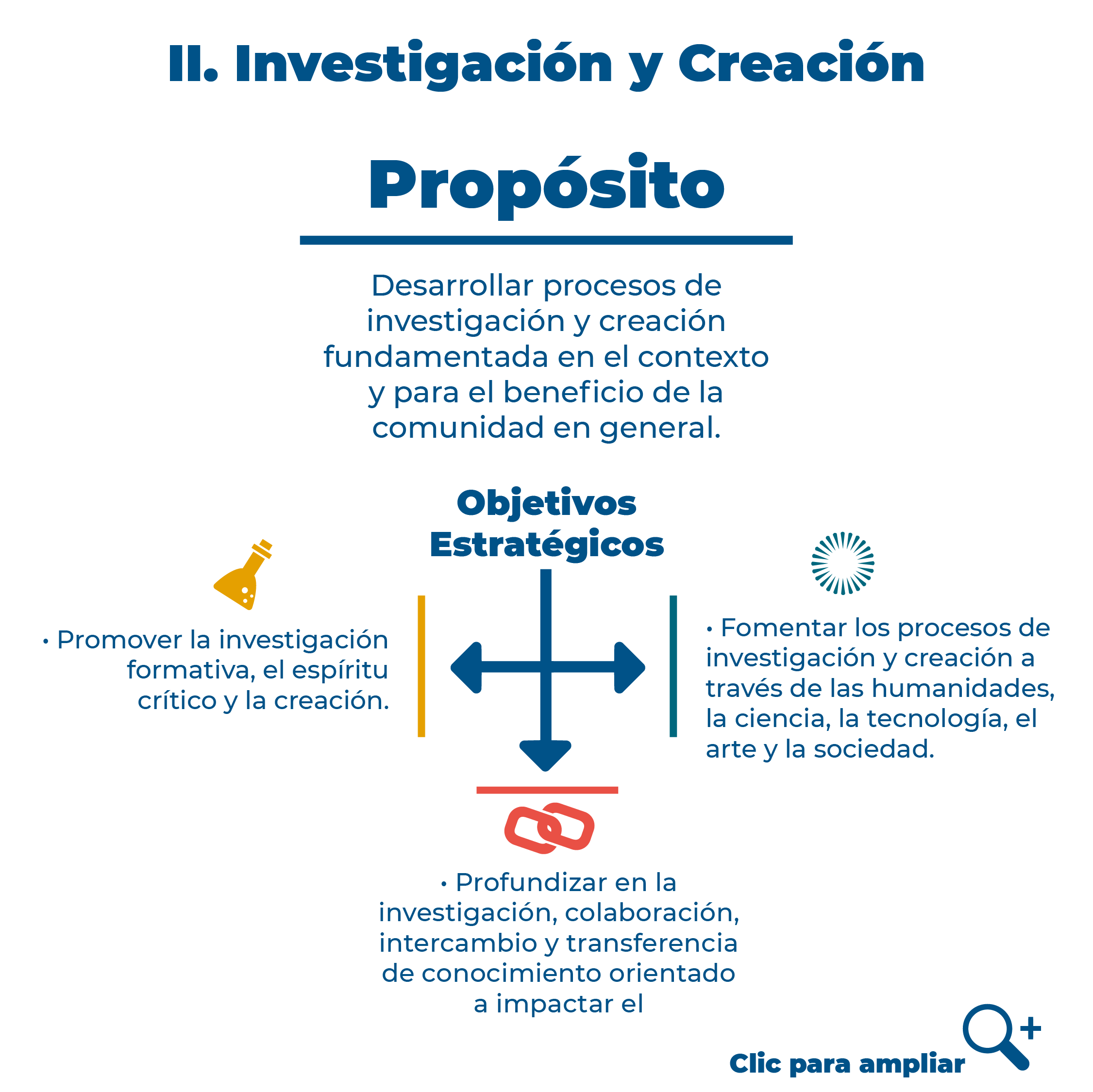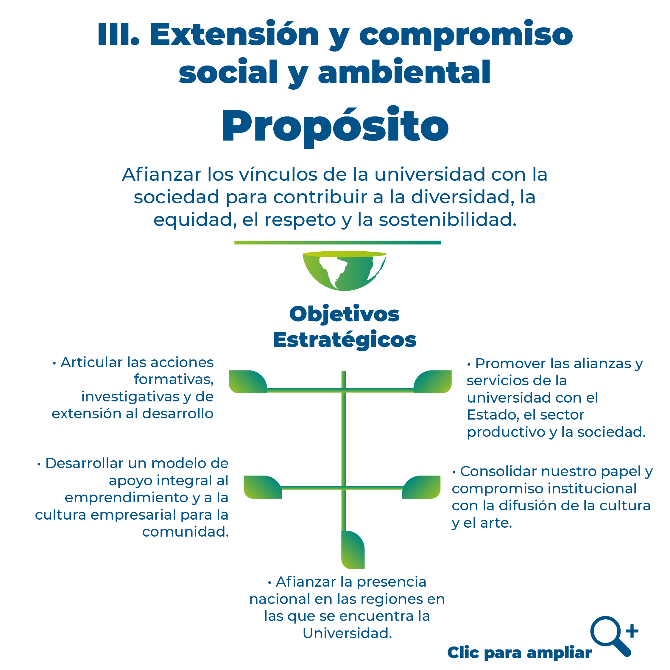 ![]() | PresentaciónEl Plan Estratégico 2022-2026 integra una expresión en la que confluyen diversas miradas respecto del futuro de la Universidad y sus desafíos con el fin de perseverar en el logro del proyecto institucional. Los temas que se han priorizado para el periodo, son aquellos que requieren una especial atención en los próximos cinco años, y lo requieren, bien porque se precisa efectuar una revisión de lo ya realizado a fin de otorgarle un nuevo impulso, siendo necesario en estos momentos iniciar su decidida ejecución y desarrollo. Visión - 2026Mirada al futuroLa Fundación Universidad de Bogotá Jorge Tadeo Lozano continuará siendo una universidad formativa y pluralista comprometida con el proyecto de vida de sus estudiantes, que propiciará su desarrollo intelectual, artístico, social y emocional como ciudadanos integrales, que contribuirán a una sociedad equitativa y sostenible. |