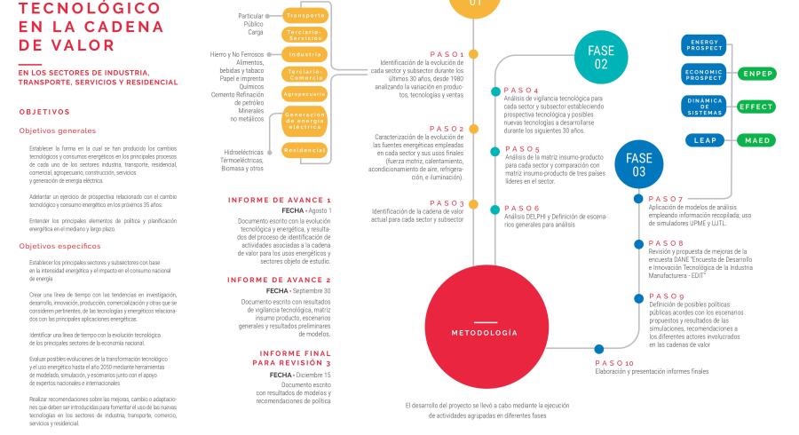 Este proyecto de investigación analiza la evolución de las principales tecnologías en los sectores de mayor consumo energético del país en los últimos 30 años; los posibles escenarios de transformación hasta 2050 y las recomendaciones sobre las mejoras, cambios o adaptaciones que deben ser introducidas para fomentar el uso de las nuevas tecnologías en los sectores de industria, transporte, terciario (comercio, servicios) y residencial.